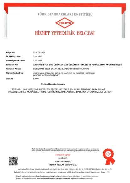 Akdeniz Fumigasyon, sunduğu hizmetlerin kalitesini ve yasal uygunluğunu ulusal ve uluslararası standartlarla belgelenmiş sertifikalarla güvence altına almaktadır. Aşağıda hizmet kapsamımızı destekleyen sertifikalar yer almaktadır.